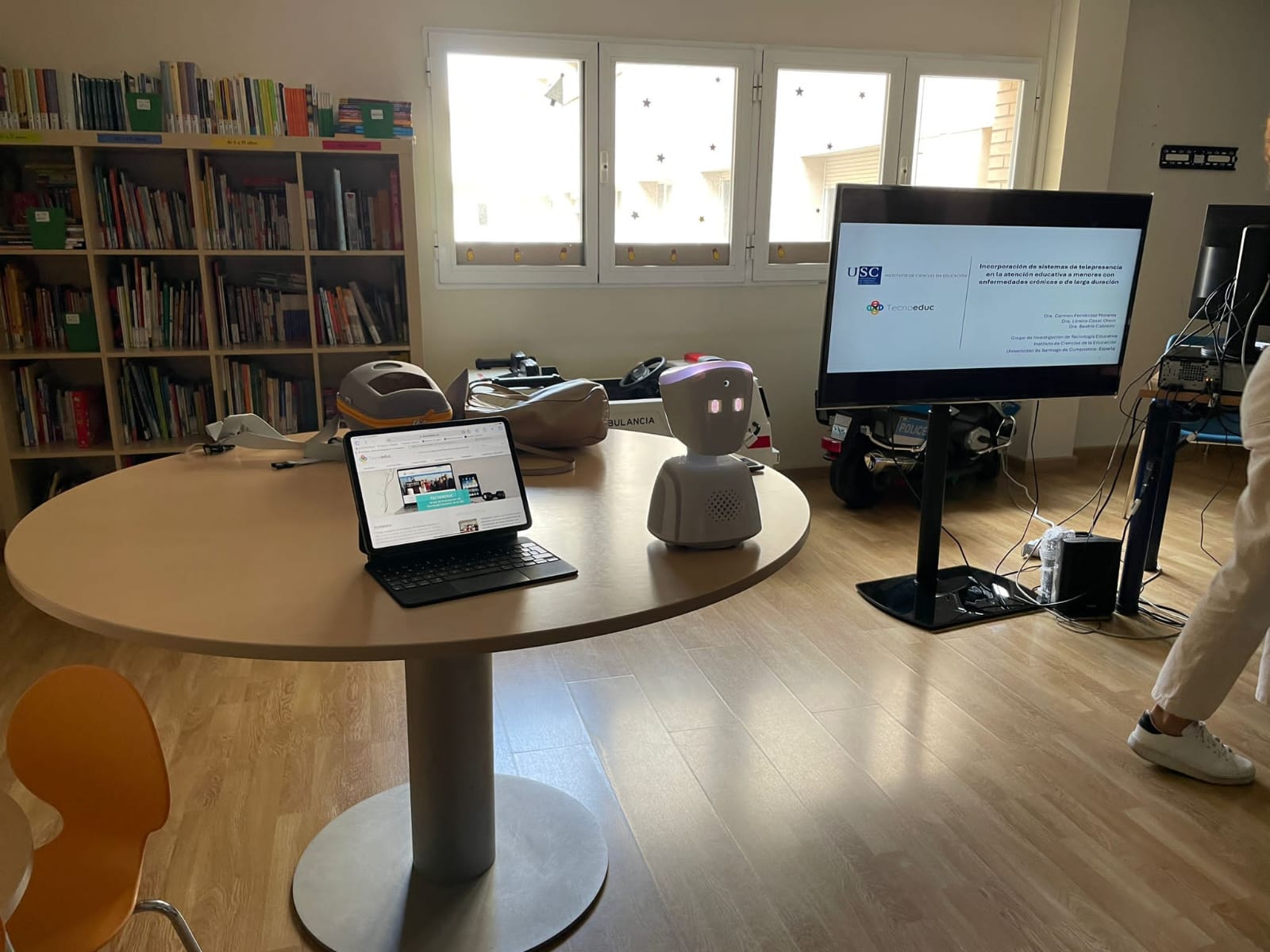 Continuando con las sesiones formativas sobre la metodología educativa del proyecto ABILITI, iniciadas el pasado 4 de octubre en la Comunidad Valenciana, el equipo del proyecto realizó una jornada de presentación en el Hospital General Universitario de Castellón. En esta ocasión, las investigadoras Carmen Fernández-Morante y Lorena Casal-Otero, contaron con la participación de cinco docentes, cuatro de ellos del propio Hospital de Castellón y uno del Hospital de Sagunto. En la jornada se presentó el potencial de la Robótica social y los sistemas de telepresencia en la atención educativa a menores y adolescentes con enfermedades crónicas o de larga duración.